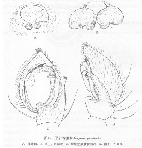 雌蛛长7.8—11.6毫米,全体基本上呈翠绿色(固定时间稍久转成黄色)。头胸部长略大于宽,除头端外,后部近乎圆形。眼区黄色,固定后眼丘银白色。背甲有灰白毛,无中窝。眼均有眼丘,前眼列强后凹,后眼列微后凹。侧眼大于中眼,前侧眼>后侧眼>前中眼>后中眼。前中眼距大...