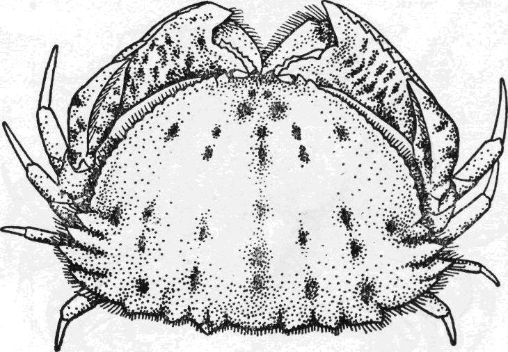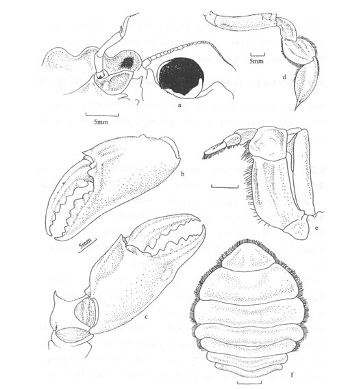 緣具顆粒。沿边緣下面密具短絨毛。螯足强