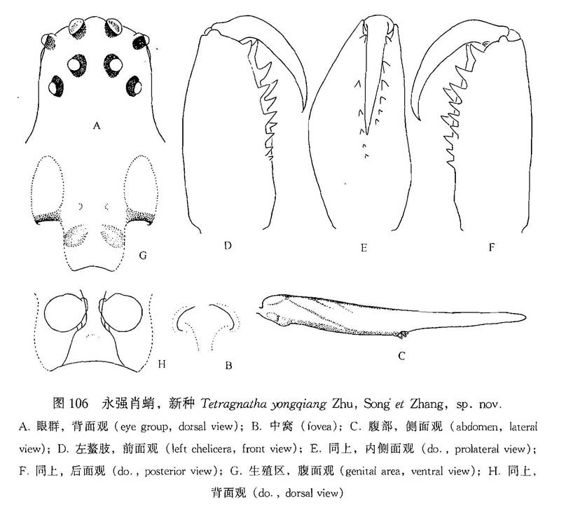 雌蛛体长12.69:头胸部长2.16,宽1.08;腹部长10.71,宽1.26。螯肢长0.88。背