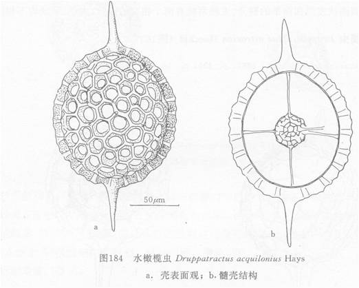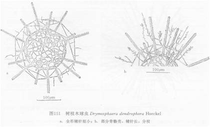 内球壳具不规则多角形的网孔;孔间桁十分瘦细,线条状。外球壳直径为内球壳直径的11/2倍。外球壳具三角形网孔与较粗桁条,桁条上有很多重复分枝或不规则分枝而弯曲的辅针。辅针略长于外球壳直径(如图151b)。有的标本辅针短,且部分不分枝(如图151a)。主针有三个齿...