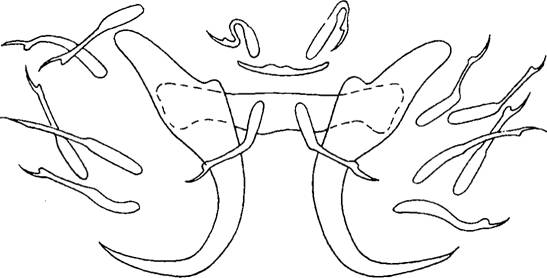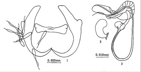 边缘小钩全长0.020—0.040mm.中央大钩全长0.064—0.1 ..mm,基部长0.049mm,外突0.002—0.005m...