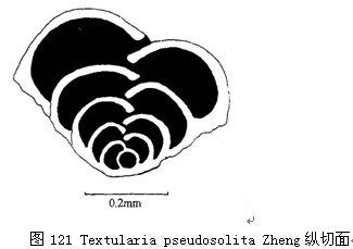 壳较小而扁,完全包旋,脐部凹陷,壳缘亚锐。房室较多而分明,3圈,终圈10—15室。缝合线清楚,微凹,近辐射状。壳壁较薄,细砂质,壳面平整但无光泽,薄水平切面可见具甚薄的深褐色实心表皮层,其下为厚的呈致密状细砂质内层,似具分布不规则的砂粒空隙;房室隔壁则是整个壳...