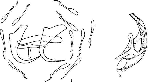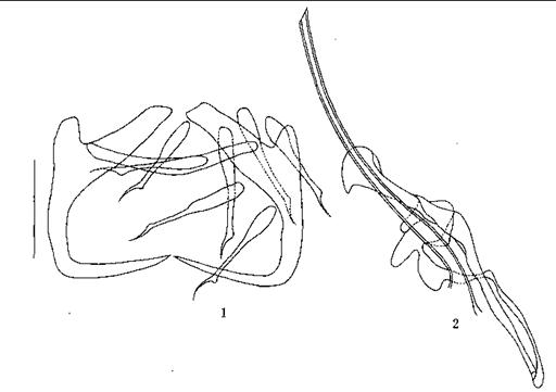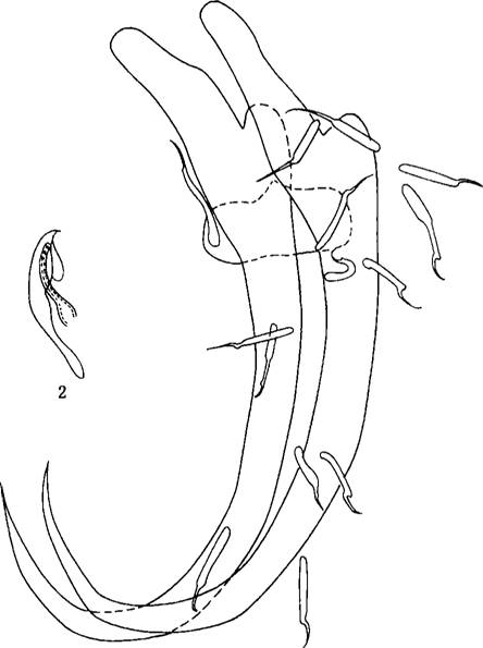 边缘小钩柄、柄轴及钩尖基突显著,全长0.024-0.026mm,钩尖长0.006mm。中央大钩全长0.029-0.030mm,基部长0.020-0.022mm。外...