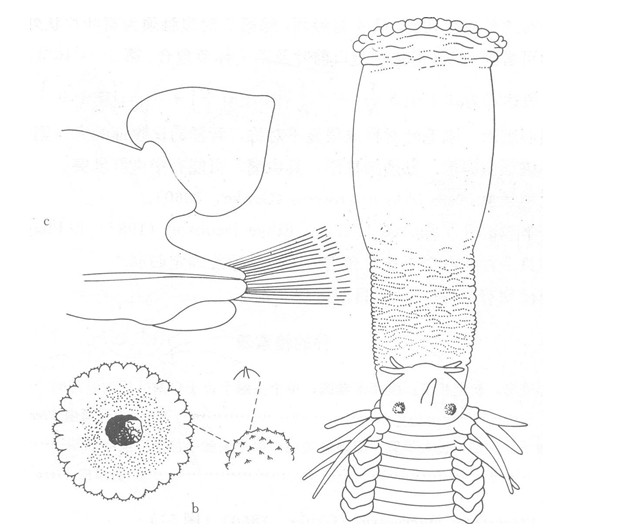 形态特征 口前叶椭圆形,较宽,眼透明。具5个短的头触手,成对的头触手短而粗,下面的一对比上面的稍大,单个的头触手比成对的细长。吻光滑或稍具皱褶,无明显的乳突,其顶端具30个软而不完全分叉的缘突,缘突的表面有圆锥形疣突。触须全部短而粗,为纺锤形具尖端。第2、3...