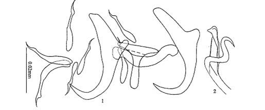 体中等大小,体长0.586-0.692mm,宽0.072-0.091 mm。后吸器与体分界明显,具2联结片。边缘小钩发育良好,明显分柄、柄轴和钩尖基突三部分,长0.01 9-0.022mm。中央大钩全长0.030-0.037 mm,基部长0.02...