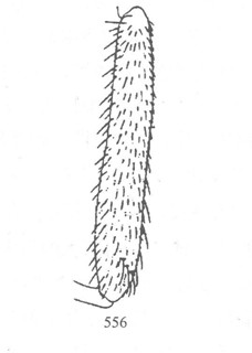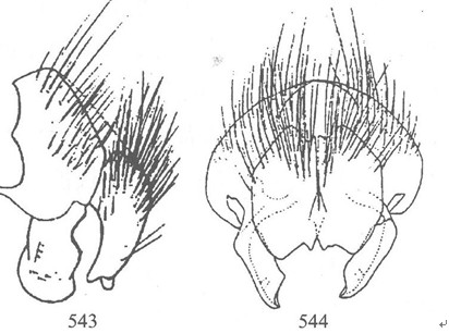 雄性 头顶平,被黑色毛,单眼三角为等腰三角形;额小而平,近复眼覆灰色粉被,中部毛黑色;颜狭,两侧平行,黑色,中突大,光亮;眼缘甚狭,光亮,被黑色短毛;新月片暗褐色;触角窝相连。复眼裸,两眼接角为锐角,其连线约3倍于额长。触角第3节淡褐色;芒黑色,很长,基部1...
