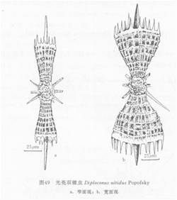 格孔壳2个,同心,外壳呈椭圆形。内外格孔壳均备由20块格孔板互相连合而成。骨针20根大致等长,扁圆状,穿过两重壳,并在中央相互结合成一颗粒。回归针8根与极针中的4根(北极:纵轴方向两根;南极:横轴方向两根)在伸出外壳不远的两个窄缘上生出相对的横突起,并再重复平...