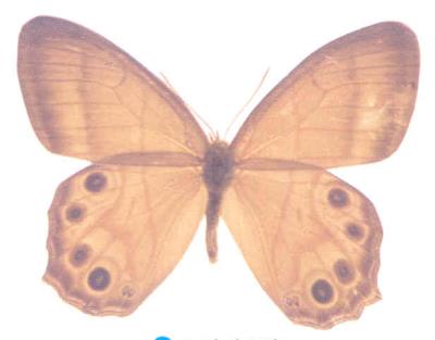 翅褐黄色。前翅近外缘有淡色宽带;后翅有4个圆形黑斑,围有暗黄色圈。前翅反面外缘、中部和近基部有3条黄褐色横带