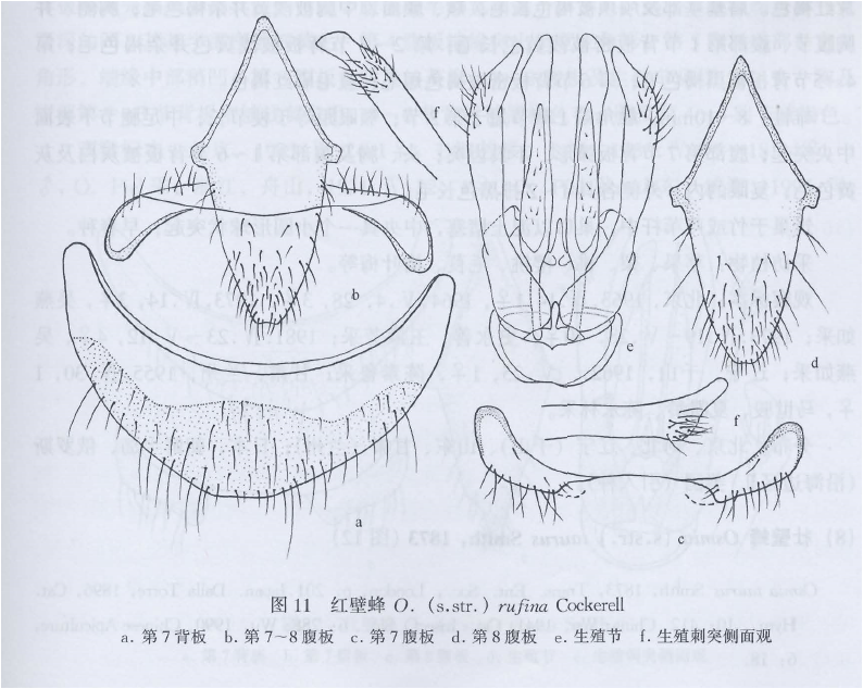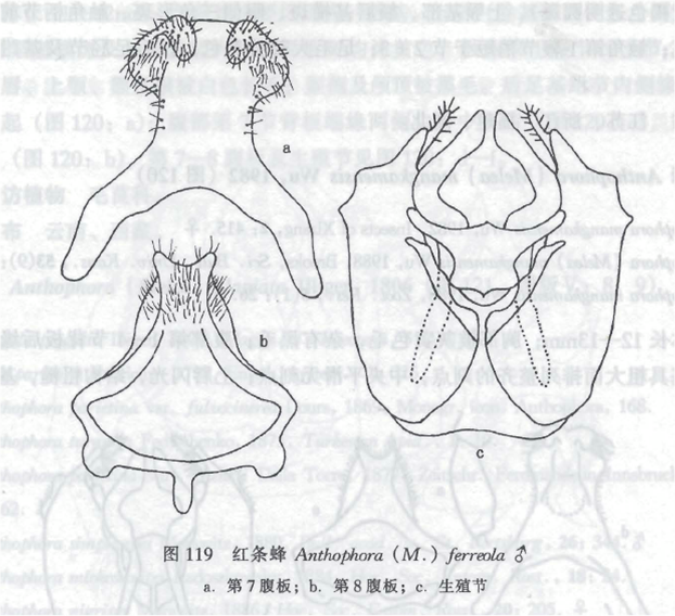雌体长12—14mm;似Anthophora plumipes,主要区别:触角第1鞭节较短。翅基片锈色,翅浅烟色;末跗节暗