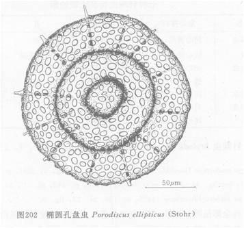 放射桁使之相连,中央室椭圆形。孔呈圆形,大小不一,排列不规则。各环的宽度约占3-4孔。外环(第二环)比内环(第一环)略宽。