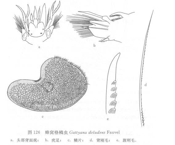 型,上具小的圆形额角。中央触手位于1个大的基节上。触角粗短。触须基部具1小束长刚毛。头部附肢除触角外其上都覆有小毛。背鳞15对,彼此相压,把身体背面整个盖满。背鳞黄色、平滑,表面具很多小的六角形结构,如蜂窝一样。靠近每个背鳞的后缘处有1个较大...