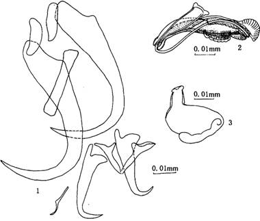 小0.048×0.044mm。后吸器与体区分明显,大小0.049×0.074mm。中央大钩全长0.024---0.028mm,基部长0.015--0...