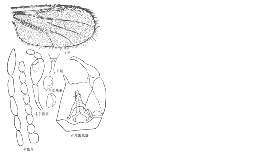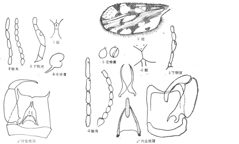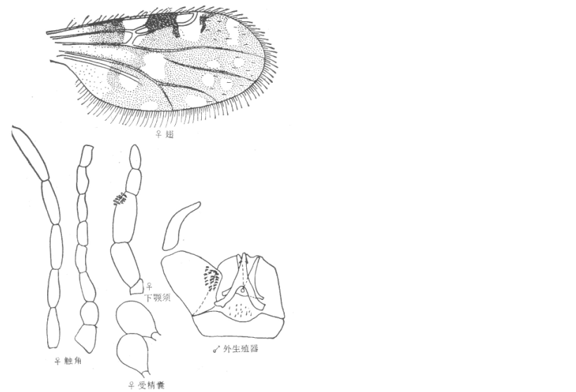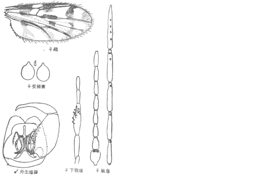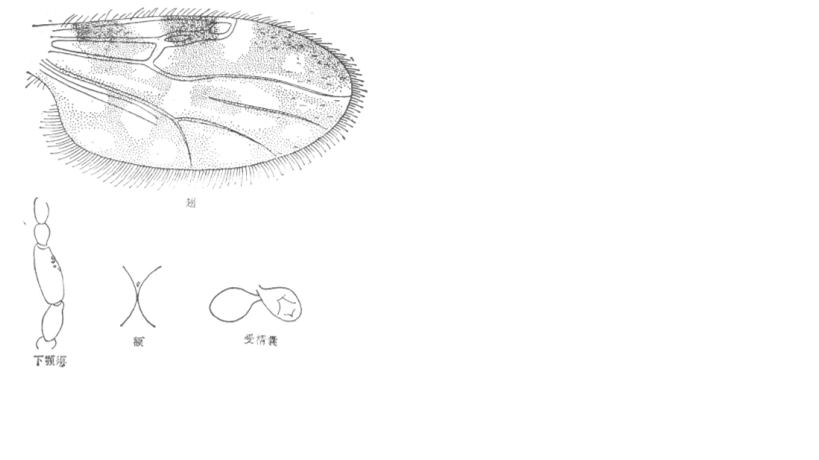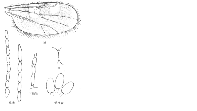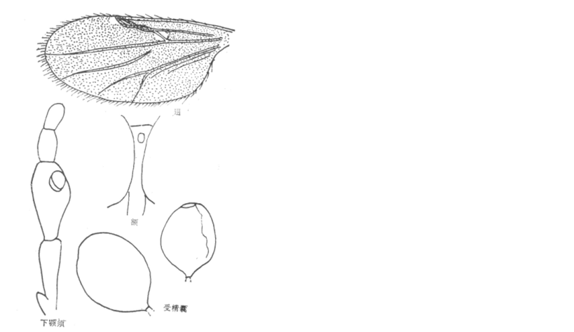 并联接,相联处长约为2-3个小眼面直径,触角嗅觉窝位于第III、XI-XV节上,触角比约为0.84;下颚须第3节不扩展,感觉器散生于节端部,无感觉窝形成;上颚有齿12-14个,外颚叶有齿约13个。