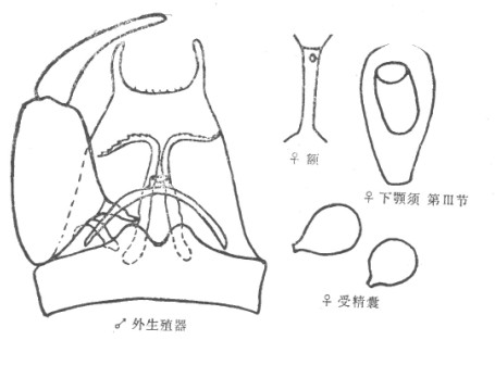 并分离,复眼间有上横缝,并时有下横缝;触角嗅觉窝位于第III-XIV节上,触角比约为1.13;下颚须第3节明显扩展,感觉器聚合于节端部一深的感觉窝内;上颚有齿14个,外颚叶有齿20个。
