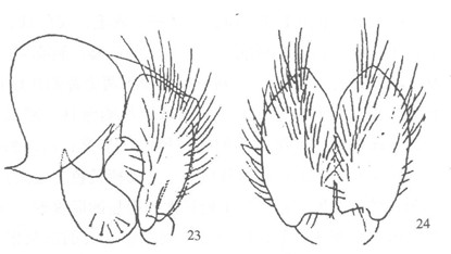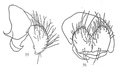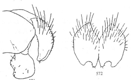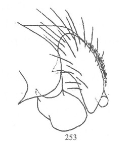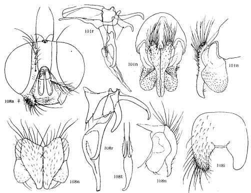 形态 ♂:体长约10.0mm。眼密生长纤毛;额宽约为触角第三节宽的2.5倍;有2上眶鬃;侧颜约为触角第三节宽的1.75倍;颊高约为侧颜宽的1.5倍;触角黑,第三节长将及宽的2倍,芒具短毳毛;口上片不突出,侧面观,在额前缘一线上;下颚须黑,末端稍呈变粗的棒状,...