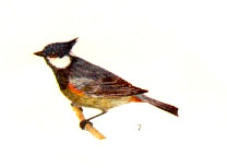 :额、头顶、冠羽和眼先概亮黑色,后颈具白斑;颊、耳羽和颈侧呈黄白色:背、腰以至尾上覆羽暗蓝灰色;飞羽和尾羽暗褐色,外侧羽片微缘以灰蓝色;颏、喉和上胸黑色;下胸和腹橄榄灰色;腋羽和尾下覆羽棕色。