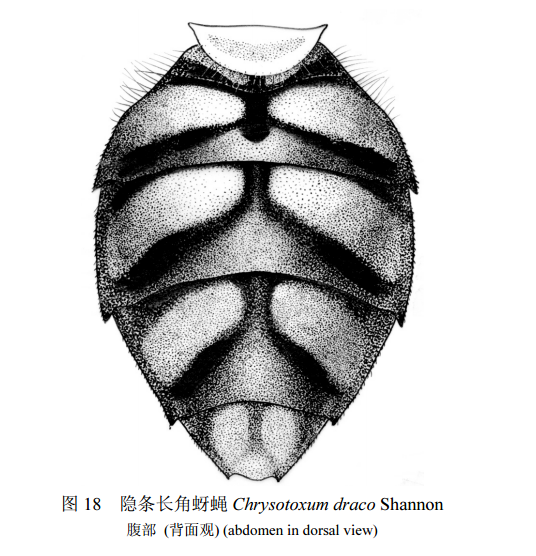。复眼离眼,被黑褐色密毛。触角黄色,第3节宽大,长不达宽的2倍,前缘明显凹入;芒基部黄色,端部褐色。中胸背板黑褐色,略覆灰色粉被,肩胛黄色,两侧黄褐色,背板密被黄色短毛,两侧具黑鬃,后缘毛黑...