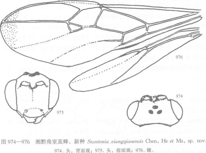体长7.7mm;前翅长7mm。触角67节。头顶有粗皱纹,在复眼后方呈弧状,略收窄。后单眼直径是单复眼间距的0.67倍。后单眼外侧沟深。背观复眼长是上颊长度的1.57倍。后头脊背观弧状,侧观弓状。颚眼距是上颚基宽的0.85倍。中胸盾片有光泽:盾纵沟会合处窄。中胸...