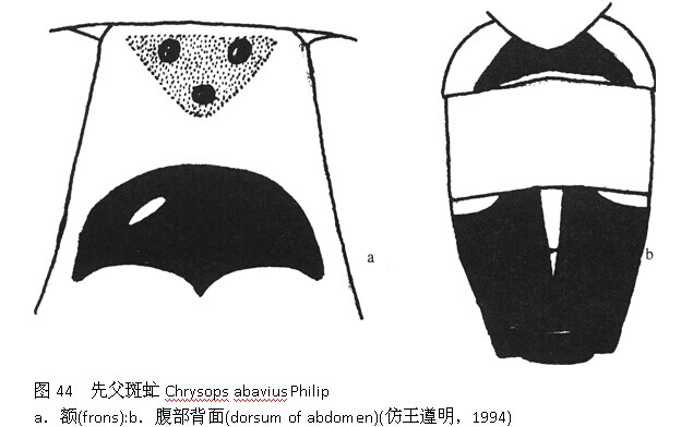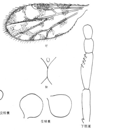 部翅基淡斑小,与第2中室基部淡斑及臀室基部淡斑相邻,第1前缘淡斑覆盖第1径室基部及径中横脉,第2前缘淡斑位于第2径室外侧,第2径室...
