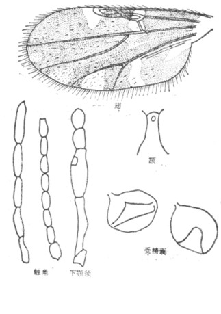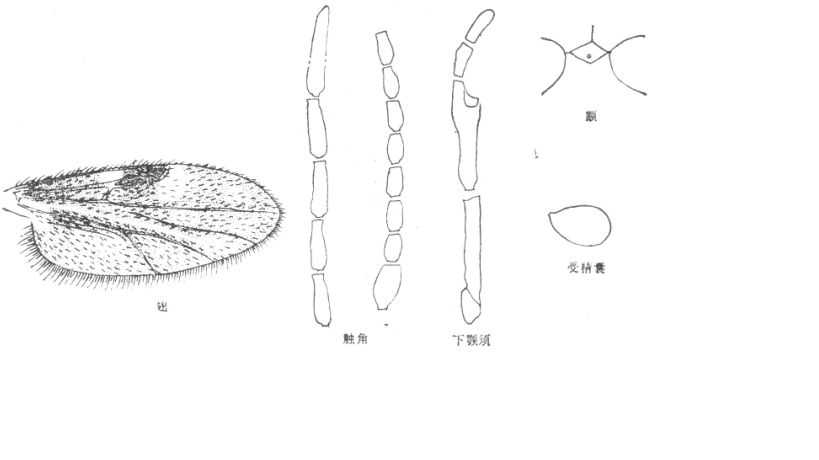 并分离,其间宽度约为2.5个小眼面直径,复眼间有上横缝,偶见复眼下部相连者;触角嗅觉窝位于第In-x节上,触角比约为1.05 - 1.15;下颚须第3节明显扩展,感觉器聚合于节端半部一感觉窝内。