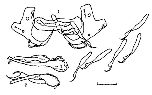 体中型,体长0.622—0.681 rnrn,宽0.091—0.1 1 6 mm.咽大小0.01 6—0.01 8mm.边缘小钩雏型,长0.0 1 0—0.0 1 4 mm.两对中央大钩的内、外突分歧明显,腹中央大钩全...
