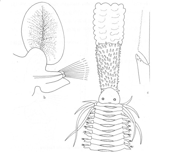 形态特征 口前叶具小的后部缺刻,脑后项突明显。眼有小的晶状体。吻基部有许多分散的乳突;吻末端部分有6纵列结瘤,使吻端部形成六面体。第2和第3体节的背须为纺锤状,很长,如果向体后伸直可达第15体节。第1体节的触须和第2体节的腹须较短而且较扁平。第2和第3体节缺...