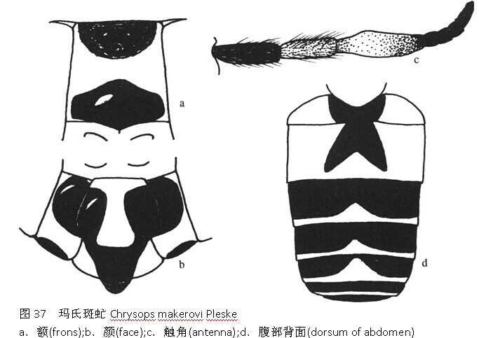 雄性 头顶和额黑色;额两侧近乎平行,前部毛黄色,后部黑色;颜正中黑色纵条达触角基部,颜两侧下部黑色宽,口缘黑色,除黑色部分