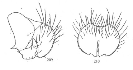 形态 ♂:体长8.2mm。眼生稀疏,参差不齐的纤毛,最长的纤毛约等于前单眼宽的1.5倍;侧额邻接,间额仅在新月片上方呈1小三角形;下眶鬃6对,伸延至额中部稍上方,上方的1—2对细小,接近眼最长纤毛长,无上眶鬃;侧额、侧颜和颊具少量灰至黄色粉被;侧颜稍狭于触角...