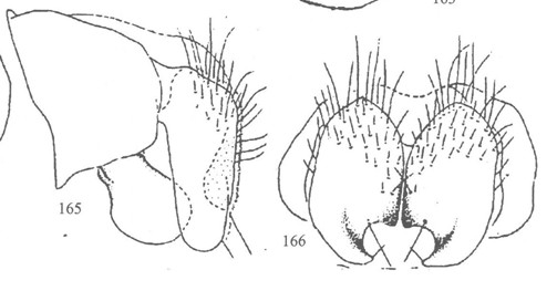 形态 ♂:体长7.5mm。眼密生长纤毛;额宽不及前单眼宽的2倍;间额黑,最狭处如线;侧额和侧颜具银灰粉被;下眶鬃仅侧额下方几对发达,上方最小的不及眼毛长;侧颜约为触角第三节宽的2/3;触角第一、二节略褐,第三节黑,后者稍大于第二节长的2倍;最长芒毛约等于触角...