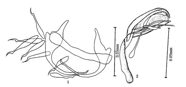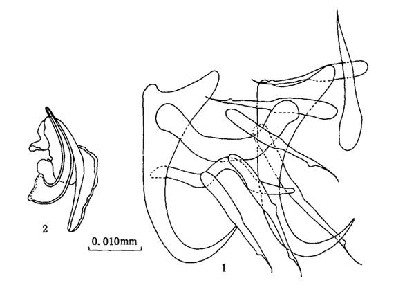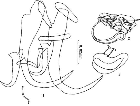 后吸器具二联结片。边缘小钩的柄、柄轴及钩尖基突区分明显。边缘小钩长0.021一0.030mm,以第2对钩最长,第6对...