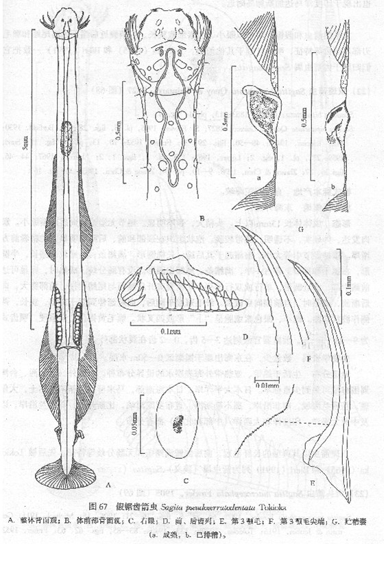 形态 成体体长达8mm以上。体细长,头小,颈不明显。尾节狭长,为体长的25%—29%,尾隔膜处无缢缩。肌肉较薄弱,半透明,侧带较宽。颈周围有薄泡状组织。腹神经节较大。前鳍自其后缘开始,狭长,布满鳍条;后鳍比前鳍长,近长圆形,稍宽,最宽处在尾隔膜后方,基...