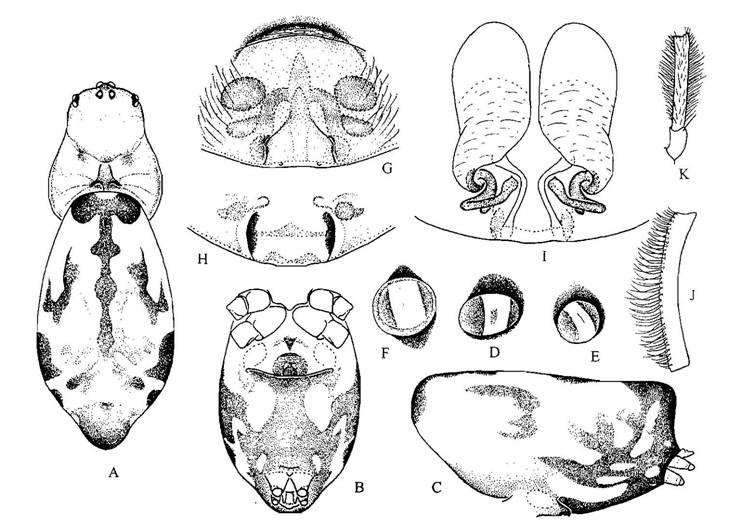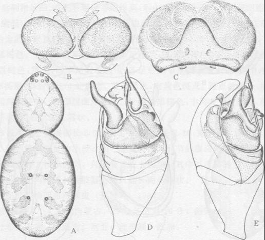 部长3.00,宽2.00。背甲橙黄色,颈沟及放射沟黄褐色。中窝椭圆形。前眼列后凹,后眼列稍后凹。前中眼间距大于前中侧眼间距(0.08:0.03),后中眼间距稍大于后中侧眼间距(0.0...