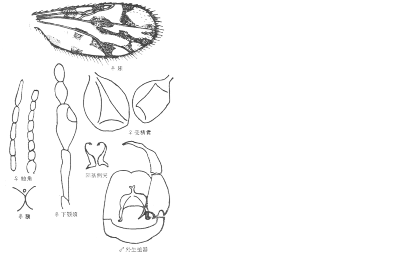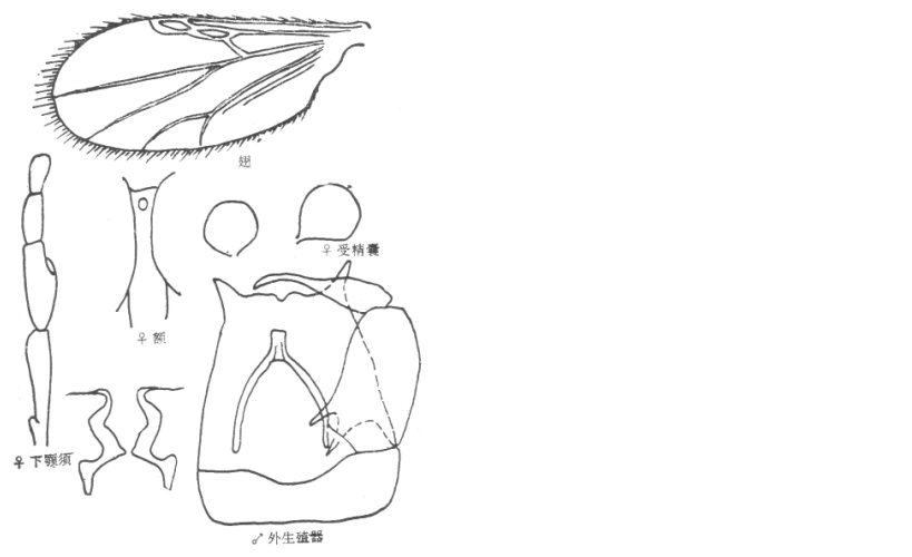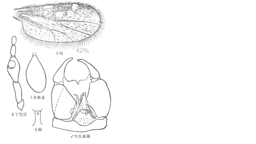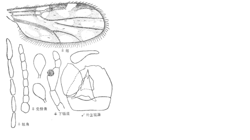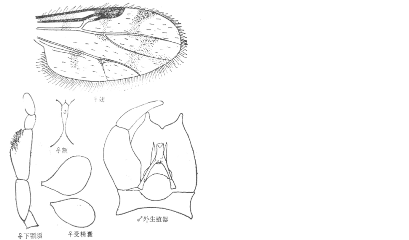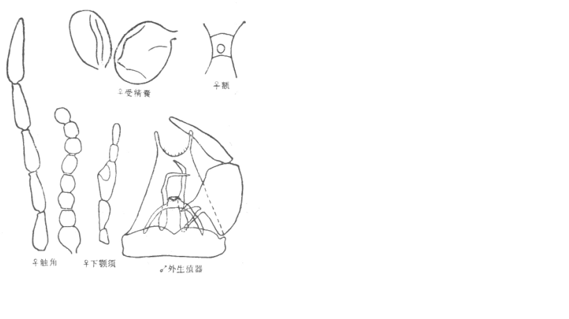 并分离,复眼间宽约为一个小眼面直径,有上、下横缝;触角嗅觉窝位于第III-X节上,触角比约为1.5;下颚须第3节明显扩展,感觉器聚合于节端部一感觉窝内,感觉窝深,达第3节之中部;上颚有齿15个,外颚叶有齿22个。