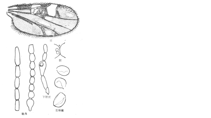 并分离,复眼间有上横缝,两复眼相距约为1-2个小眼面直径;触角嗅觉窝经常位于III-VI、XI-XIV节上,触角比约为1.22;下颚须第3节明显扩展,感觉器聚合于节端半部一大型感觉窝内。