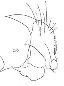 形态 ♂:体长7.5—8.5mm。眼密生浅色长纤毛;额等于或稍大于前单眼宽;侧额下半部具6对下眶鬃,无上眶鬃;侧颜约等于触角第三节宽;触角褐色,芒长羽状,最长芒毛约等于触角第三节宽的1.5倍;颊前上缘具2列上倾口缘鬃;颊高约为眼高的1/4强;口上片不突出;下...