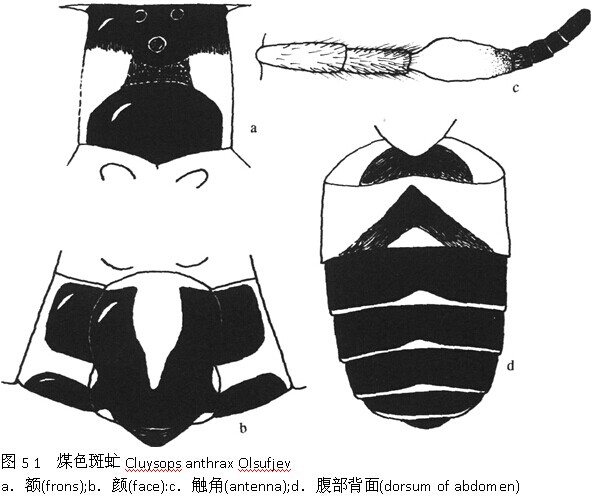 雄性 头顶黑色,被金黄色粉被,被毛主要黑色;额黄色,被黄色粉被,沿两侧具黄色毛;颜黄色,覆黄色粉被,两侧具毛,颜面下部和口缘褐色,中突不明显,无中条纹。触角橙色;芒褐色,