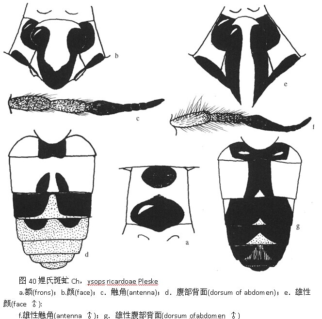 雄性 头顶三角黑色,覆淡黄色粉被和黄毛;额淡黄色,被黄色长毛,前端混有黑短毛;颜黄色,正中纵条淡褐色,或仅中突淡棕色,两侧黄色毛较长。复眼