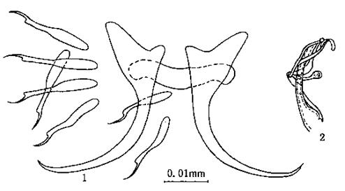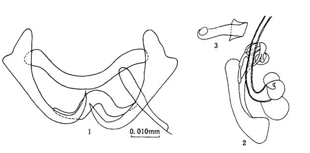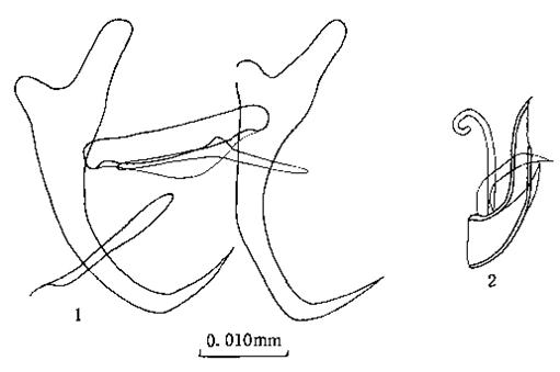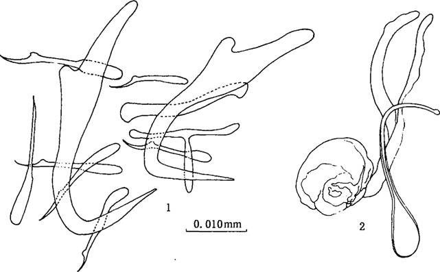 边缘小钩柄、柄轴及钩尖基突显著,全长0.029—0.041mm。中央大钩全长0.037—0.039mm,基部长0.033mm,外突0.0...