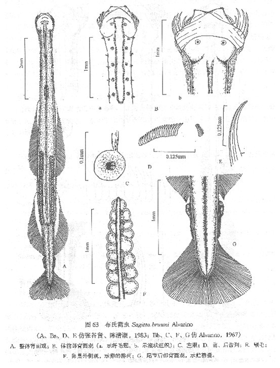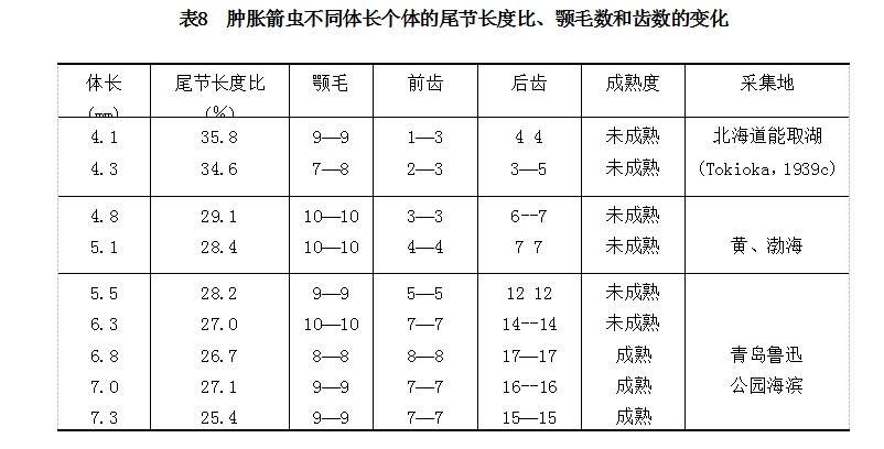 形态 成体体长可达13—14mm。体细长,不强壮,但颇硬挺。头中等大小,颈明显。尾节长为体长的19%—22%。肌肉薄,透明-半透明,侧带宽,其宽度几近体的宽度,使动物呈圆柱或方柱形。眼圆形,两眼间距大,眼色素细胞“E”形。颚齿式