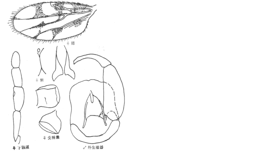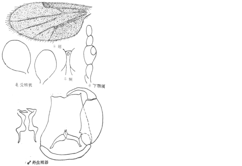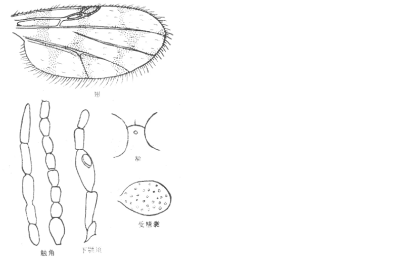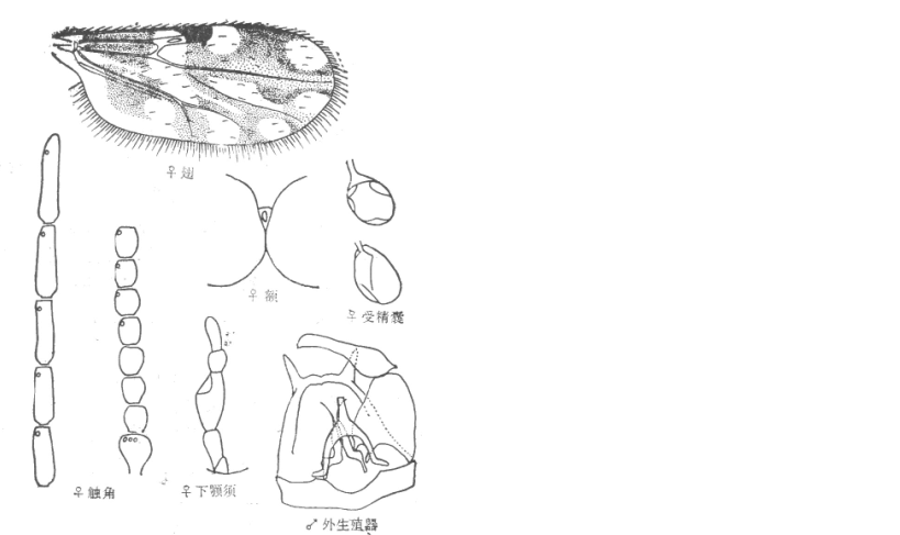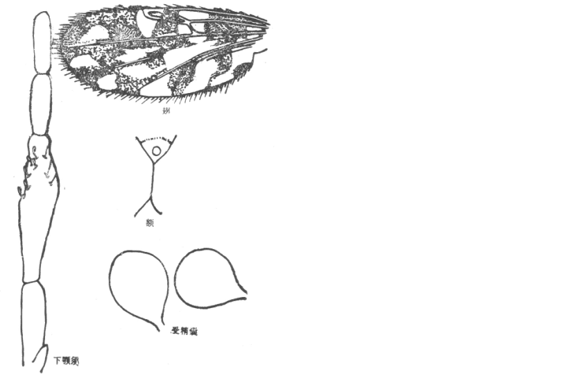 并分离,其间约10微米宽,有上横缝;触角嗅觉窝位于触角第III、V、VII、IX—XIV节上,触角比约为1.19;下颚须第3节粗短,扩展明显,感觉器聚合于近节端部一感觉窝内;上颚有11个齿,外颚有齿11个。