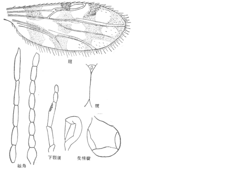 雌蠓:头部褐色;两复眼光