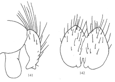 ♂:眼裸,额宽约为头宽的0.24倍;头顶及侧颜上端灰黑,仅内顶鬃发达,侧后顶鬃3;间额黑,宽为一侧额的1.8倍,头前面包括颊大部粉被银白,微带黄铜色,后倾上眶鬃1,下眶鬃9—16,列外侧小毛约2行;侧颜宽为触角第三节宽的...