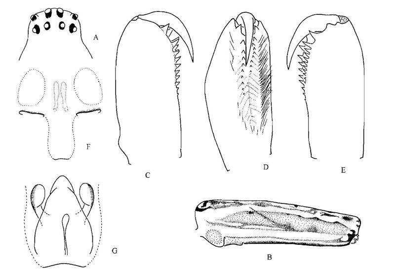 于前侧眼,前中眼间距约等于2倍前中眼直径,前中、侧眼间距等于前中眼直径的6.7倍。后中眼