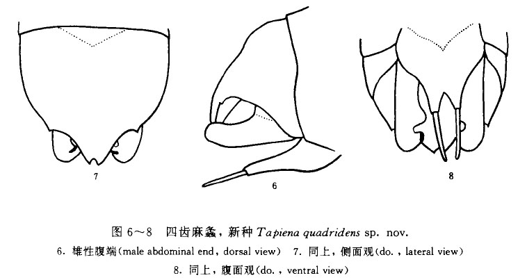 节腹面内缘具4个刺,外缘具5个刺。后足胫节背面内缘具17个刺,外缘具13~14个刺。第10腹节背板较宽