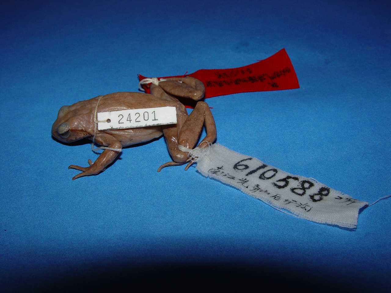 于吻长;胸、腹部几乎无斑纹;蝌蚪尾部无斑点,唇