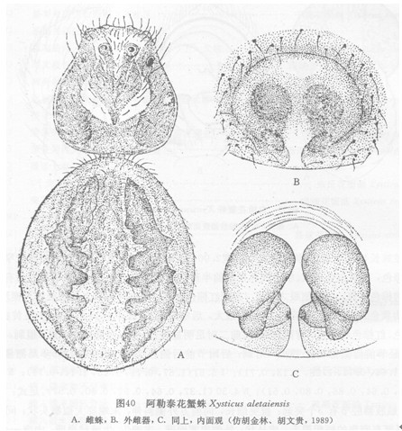 雌蛛长7.80—8.00毫米。正模长8.00毫米:头胸部长2.90,宽2.60;腹部长5.10,宽3.80。头胸部长略大于宽,中央部位颇隆起,正中斑呈黄白色,其两侧各有一浅棕色纵带,纵带之外侧边缘,显有黑褐色斑,在中窝部位有一倒三角形褐色,其前方至后眼列,有一...