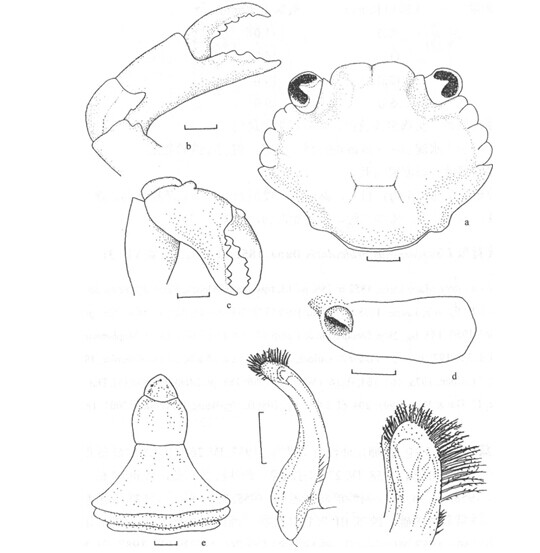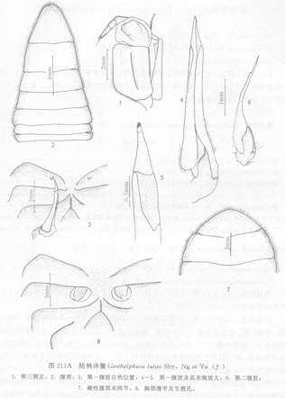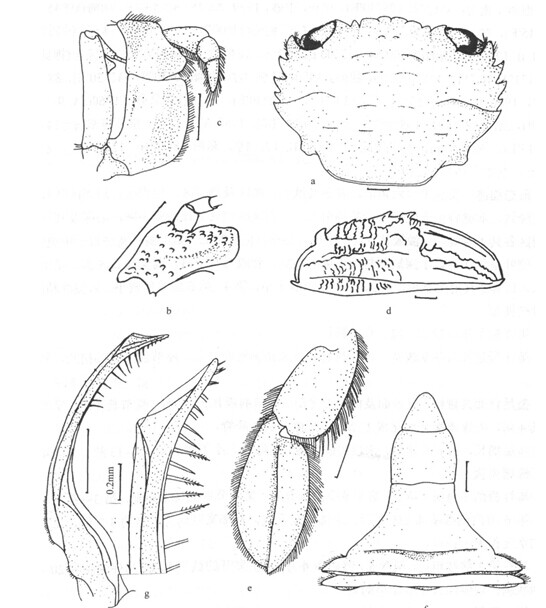 形态描述 头胸甲呈六角形,表面具绒毛,额区及侧胃区、中胃区、后胃区各具1对短隆线,前鳃脊由前侧缘末齿基部引入,在胃区两侧处为颈沟所中断,心区及其两侧中鳃区各具1对隆线。额缘共6叶,中央叶突出,位置略低,第1侧叶宽平直于中央叶,第2侧叶呈角状,以1深缺刻与第1...