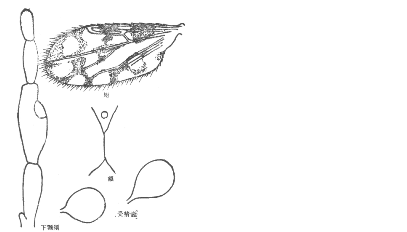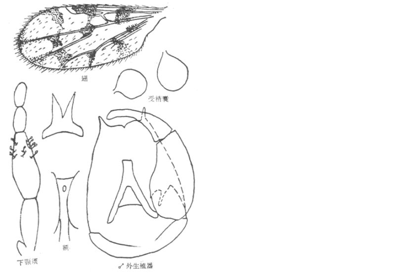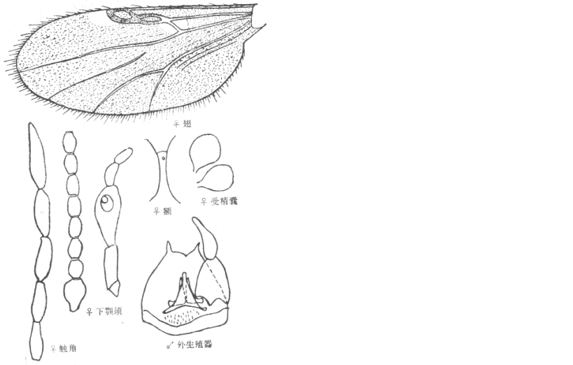 形态特征 ♂ 体长8.5毫米。额约为前单眼的2倍宽,间额约为一侧额宽的2倍,间额鬃一对,长大,下眶鬃6对。触角全黑,第三节约与第二节等长,芒