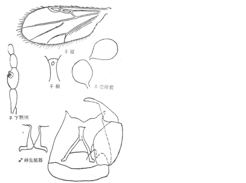 部翅全呈淡色,无暗斑,长毛布于翅端部一半,向基部渐稀少;后足胫节鬃4-5根。