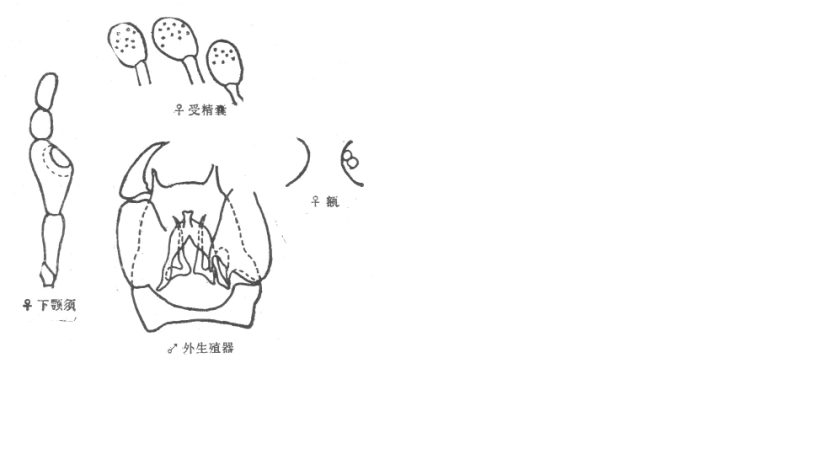 并连接;触角嗅觉窝位于第1II、XI-XV节上,触角比约为1.15;下颚须第3节略扩展,感觉器散布于节端半部,不形成感觉窝;上颚有齿6-8个,端部一个齿最大。